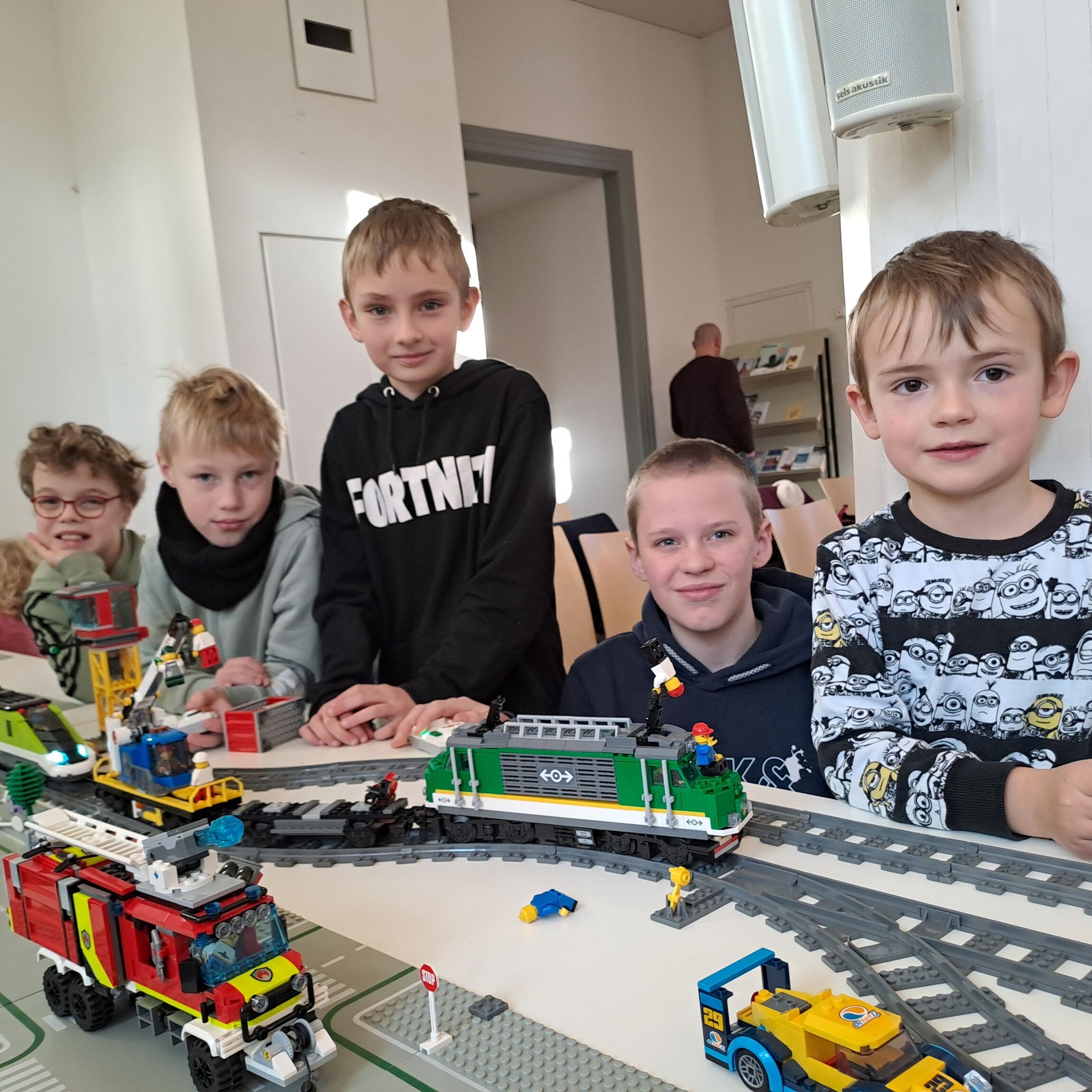 Eine Grundausstattung an Lego ist vorhanden. Aber natürlich darf jeder auch eigene Lego-Sets mitbringen. Wir unterteilen die Tische mit kleinen Markierungen, sodass am Ende nichts durcheinander kommt. Im letzten Jahr haben wir das bei den Eisenbahngeschichten schon gut eingeübt.